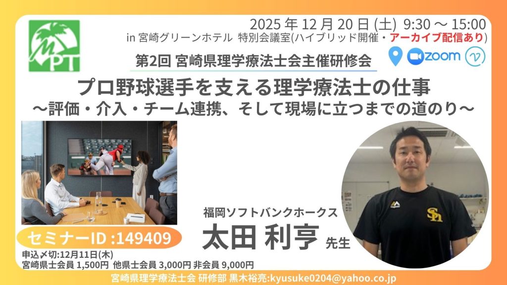 本研修会は、福岡ソフトバンクホークスの太田利亨先生を講師にお招きし、「プロ野球選手を支える理学療法士の仕事」をテーマに実施する予定です。